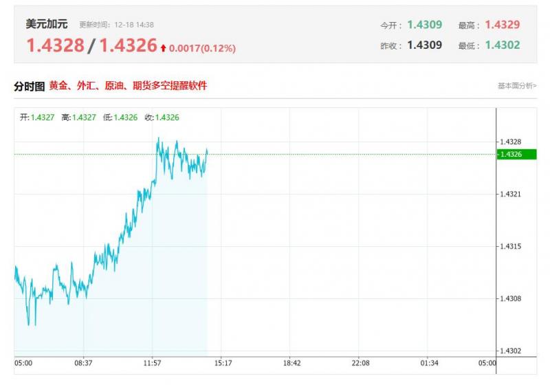 周三盘中,美元/加元报1.4326 ,涨幅0.12%。