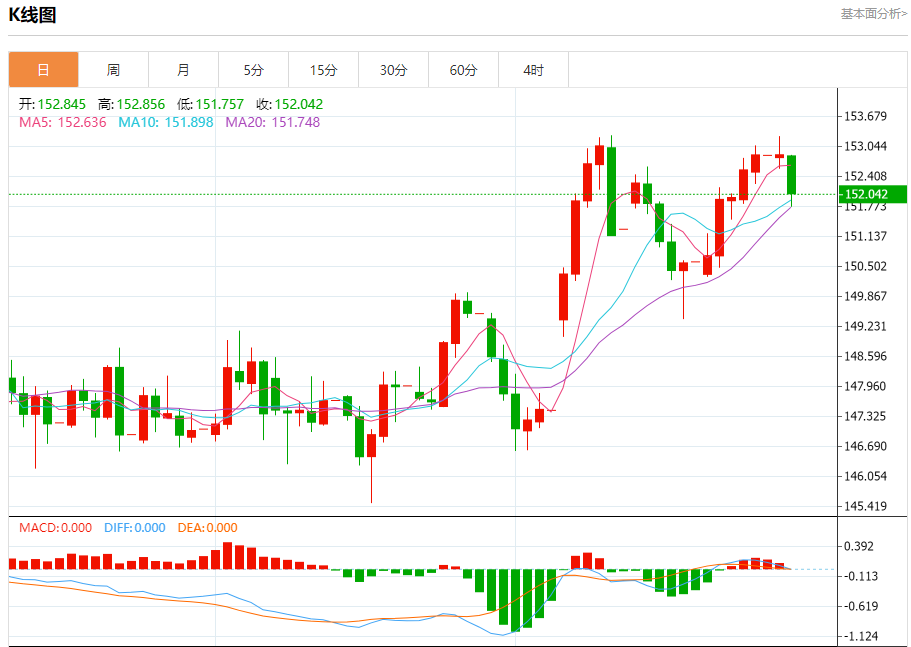今日周二,截止目前美元兑日元报152.044,下跌0.55%。
