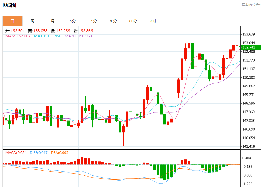 今日周一,截止目前美元兑日元报152.766,下跌0.08%。