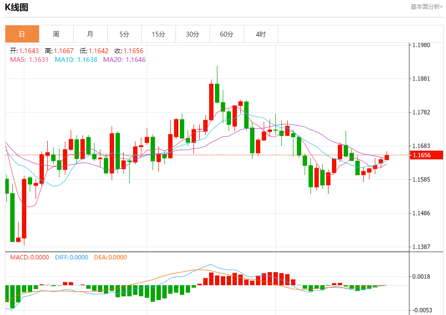 汇价高见1.1668,低见1.1643。上一交易日,汇价收于1.1644。