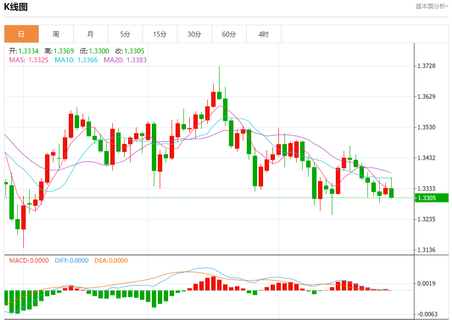 汇价高见1.3369,低见1.3300。上一交易日,汇价收于1.3334。