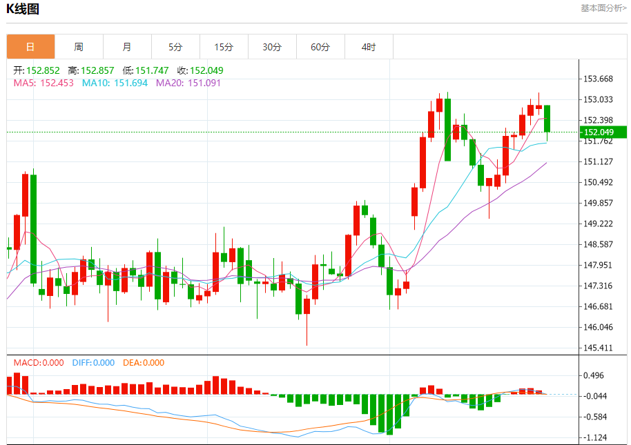 汇价高见152.856,低见151.757。上一交易日,汇价收于152.869。