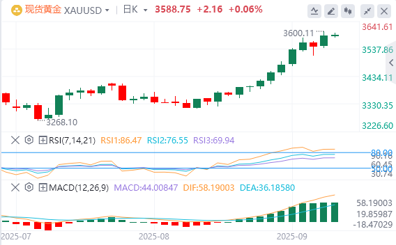技术面:日线图上的相对强弱指数(RSI)指标保持在70以上,表明黄金在技术上处于超买状态,可能在上涨趋势继续之前出现技术修正。在这一点上,确定黄金的上行技术目标是一项困难的任务,因为它仍然接近历史高点。因此,3600美元(整数关口)一旦黄金稳定在3600美元以上并确认该水平为支撑,可能被视为下一个心理关口。向下看,3500美元(前阻力,之前的历史高点)可能被视为第一个支撑位,随后是3450美元(静态水平,前阻力)和3405-3400美元(20日简单移动平均线,整数关口)。