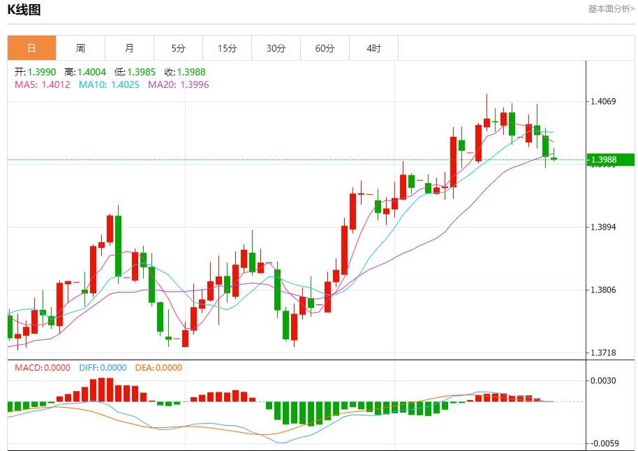 技术点评:RSI技术指标小于中性区域50。 MACD技术指标处在其信号线之下看空。 配置为负。 此外,价位低于其20天及50天移动平均线 ( 分别位于1.4003 和1.4008 )。