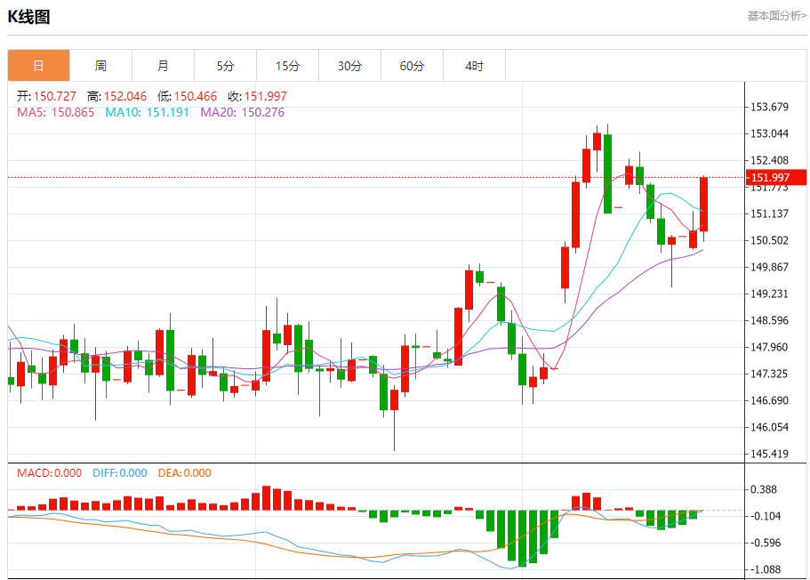 汇价高见152.037,低见150.457。上一交易日,汇价收于150.732。