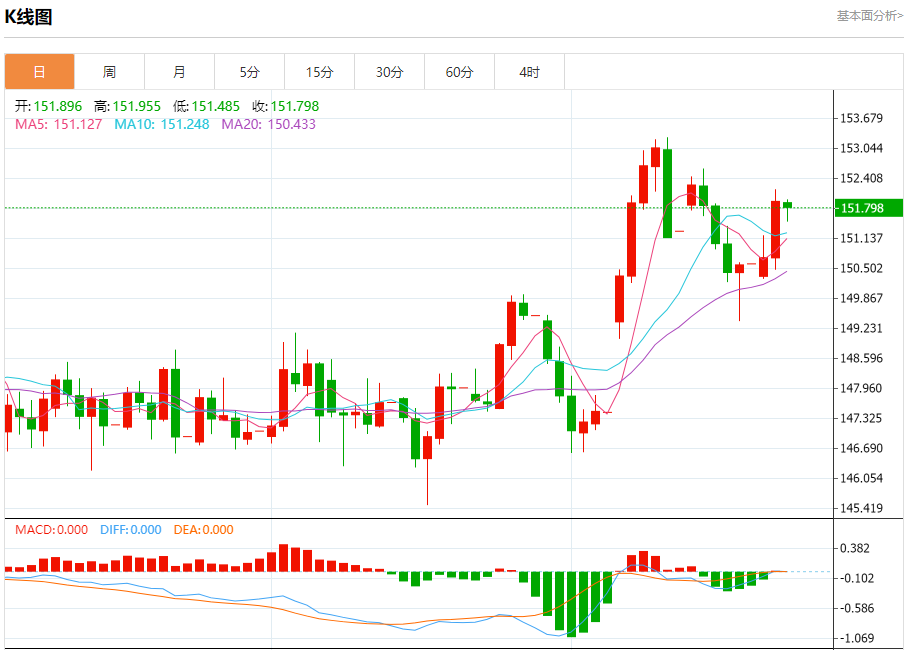 汇价高见151.955,低见151.485。上一交易日,汇价收于151.910。