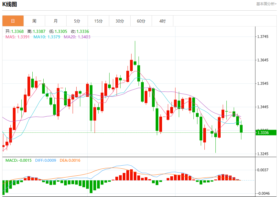 汇价高见1.3387,低见1.3305。上一交易日,汇价收于1.3368。
