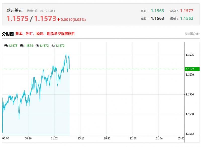 欧元兑美元今日汇率最高1.1575 ,最低1.1573 ,涨跌0.0010 ,涨跌幅0.08% 。