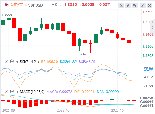 欧元:截至发稿,欧元/美元徘徊在1.1620附近。随着美国政府关门延长至第23天,交易员等待美国9月消费者价格指数(CPI)数据的发布,欧元/美元货币对忽略了大部分数据,因为交易员的注意力转向了美国对华的贸易言论,预计该数据将显示总体和核心CPI跃升至3%以上。技术面上,突破50均线1.1627将为测试阻力位1.1685–1.1700打开道路。