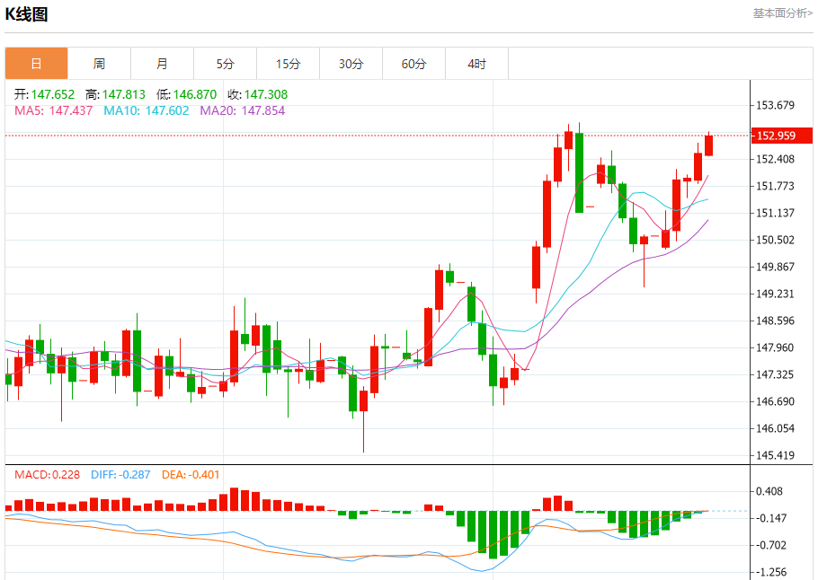 汇价高见153.058,低见152.468。上一交易日,汇价收于152.549。