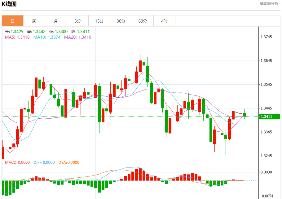 汇价高见1.3442,低见1.3399。上一交易日,汇价收于1.3427。