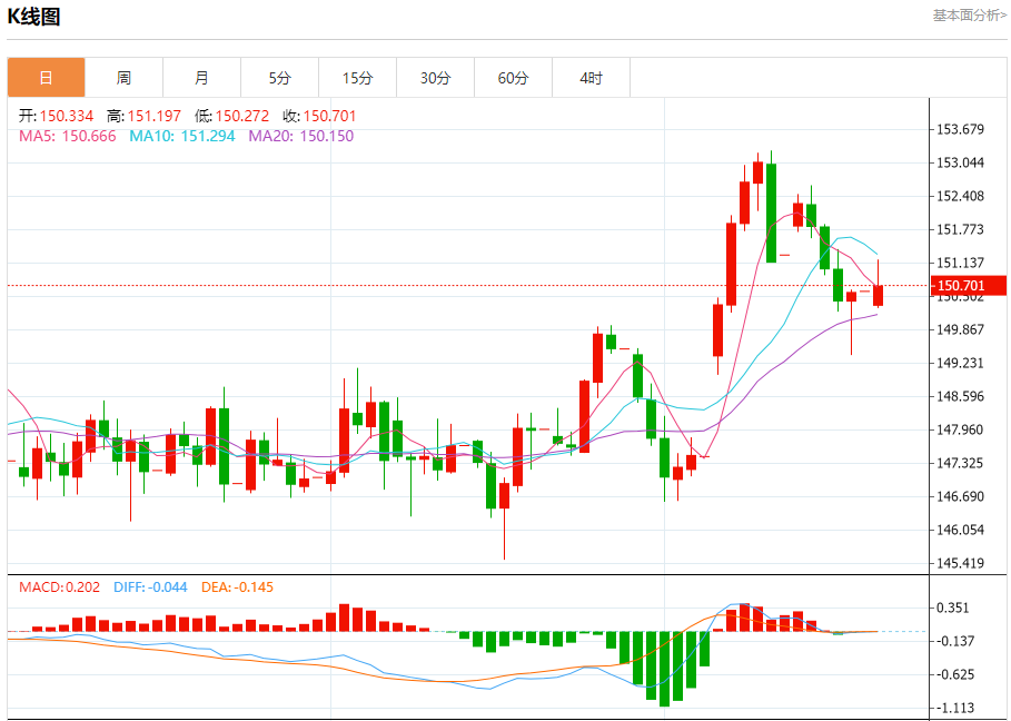汇价高见151.190,低见150.263。上一交易日,汇价收于150.618。
