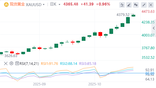 周五亚盘,黄金徘徊在4365.48附近。亚市早盘,现货黄金继续冲高,一度上涨1.24%,刷新历史高点至4379.38美元/盎司,较周四收盘价上涨逾50美元,本周迄今已经上涨近9%,周线大概率连续第九周上涨。黄金当前的暴涨是多重利好叠加的结果:美联储降息预期提供流动性支撑,中美贸易紧张和地缘政治风险激发避险需求,美元走弱与经济不确定性则放大黄金魅力。机构展望显示,牛市有望延续至2026年,甚至更高,但投资者需警惕短期波动和政策变数。面对全球不确定性加剧的时代,黄金无疑仍是值得关注的资产,或许5000美元大关并非遥不可及。建议投资者密切跟踪市场对美联储会议的预期变化和国际贸易局势相关消息,并留意地缘局势相关消息。