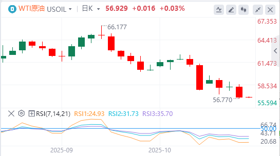 WTI原油在日线时间框架上形成了一个空头缺口,跌破每桶60.00美元的心理水平,目前交易于56.96美元附近。 这种下跌趋势表明,抛售压力正在加剧,可能为未来的进一步亏损铺平道路。下一个主要支撑位位于55.00美元附近,这与今年早些时候的低点相符。 持续跌破当前水平