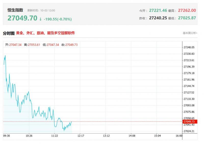 港股午评:恒生指数跌0.87%,恒生科技指数跌1.44%
