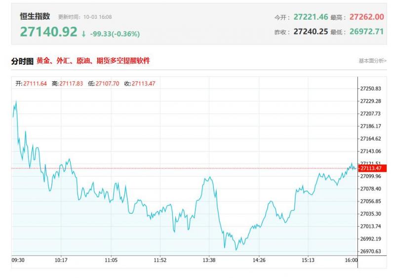 香港恒生指数10月3日(周五)收盘下跌146.2点,跌幅0.54%,报27140.92点;