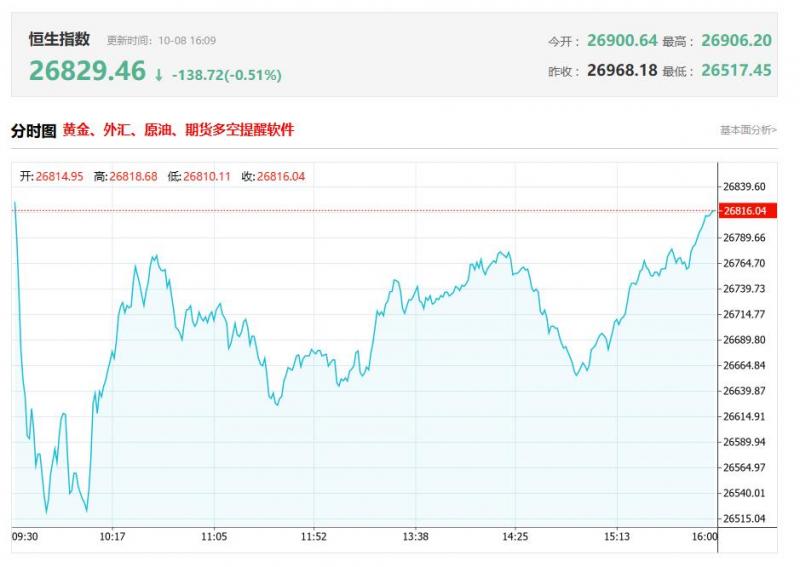 香港恒生指数10月8日(周三)收盘下跌128.31点,跌幅0.48%,报26829.46点;