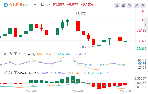 10月10日,周五亚市盘中,原油交投于61.20美元附近。由于中东地缘政治紧张局势缓解,WTI失去了吸引力。交易员将密切关注美国联邦政府关门将持续多久。