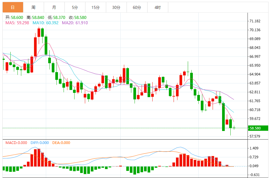 周三(10月15日),美原油价格交投于58.560美元/桶附近,跌幅为0.22%。