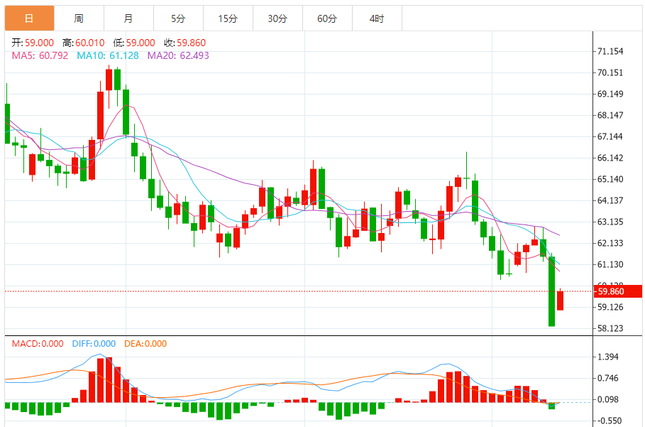 周一(10月13日),美原油价格交投于59.830美元/桶附近,涨幅为1.60%。