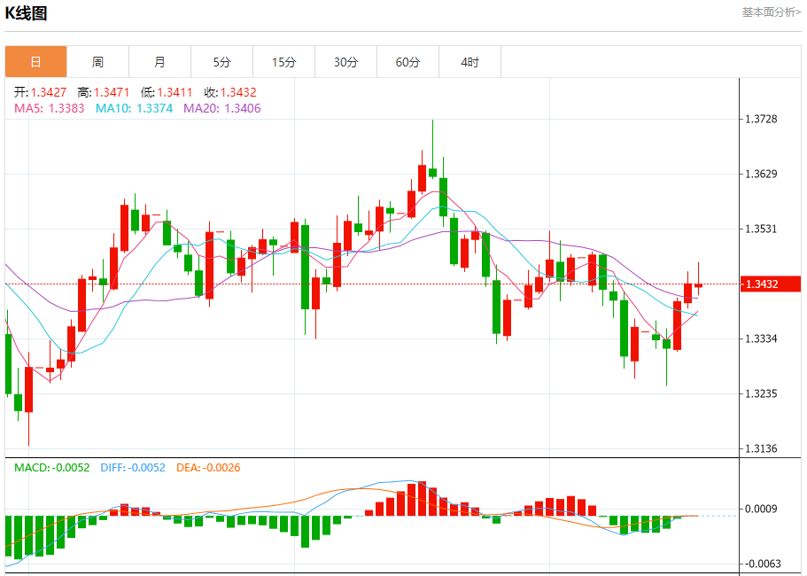 汇价高见1.3471,低见1.3411。上一交易日,汇价收于1.3432。